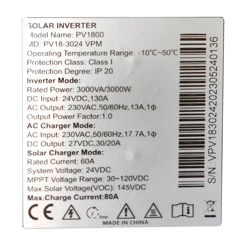 اینورتر PV18-3024 یک انتخاب عالی برای تأمین انرژی پایدار در سیستمهای خورشیدی و سایر کاربردهای اضطراری است. با امکانات پیشرفتهای که دارد، از جمله نمایشگر LCD، قابلیت اتصال به شبکه برق و سیستمهای خورشیدی، و همچنین حفاظتهای متعدد در برابر اضافهبار و دما، این محصول گزینهای مطمئن و کارآمد برای کاربران در محیطهای خانگی و اداری به شمار میآید.